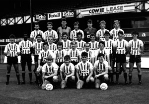 In truth the Roker Roar expected promotion. We sat back and waited for it too happen. It didn’t materialise and by the end of the season Sunderland saved their skins...just. We ended in 18th place to record our worst season ever. It was truly depressing. The season started horrendously with 5 consecutive defeats, before our first goals and point came in a 3 v 3 home draw with Grimsby Town. The greeting of such a result as if we had just won through to the next round of the FA cup just about summed things up. Two games later and we recorded our first victory, at Gay Meadow. We followed this up on 28 September with our first home win, against Huddersfield Town. From then on in, it’s all about the odd victory here, consecutive defeats there and a few draws liberally sprinkled. Perhaps an only highlight was the 4 v 2 demolition of Leeds United 11 January 1986 when Nick Pickering scored a hat trick. In the end 2 home victories "saved our bacon", but it had been oh so disappointing. Anyone who said otherwise had a bad case of myopia. The cup competitions had brought no relief. We were dumped out of the League cup by Swindon town, then in the 4rth division, Manchester City defeated us on penalties at Maine Road in the Full Members cup. Finally Manchester United thrashed us at their place 0 v 3, having disposed of Rochdale in the previous round only 2 v 0. If we thought that this had been bad then what lay before us in the next 12 months was something that we had dreaded, but many of us thought inevitable. |