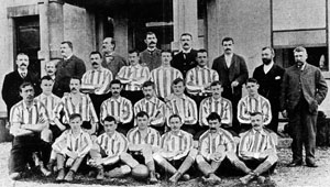 24 November saw the visit of Liverpool to Newcastle Road, with the press commenting that "the record of the Liverpool side is about the worst in the league". How times would change. 5 December saw Sunderland play the Rest of the League at the Westoe Ground, South Shields in a benefit match for the widow and family of NJ Ross. It is worth noting the opposition side: Hillman (Burnley), Crabtree (Burnley), Holmes (PNE), McCartney (Liverpool), Saunders (PNE), Cunningham (PNE), Ross (Liverpool), Goodall (Derby), Deckton (PNE), Drummond (Liverpool) By the turn of the year Sunderland had dished out some thrashings; Queens Park 8 v 1; small Heath (Birmingham City) 7 v 1, but the biggest was reserved for the English Cup. Fairfield were the opponents. Sunderland then defeated Preston North end and Bolton Wanderers and for the 3rd time in their history were into the semi finals. However Aston Villa defeated Sunderland, t Blackburn 1 v 2, and would inflict 3 FA cup defeats in 4 seasons, including 1894/95, twice in semi finals. This would prove a mixed blessing for the Football Association. After Villas' 1895 FA cup triumph the trophy was put on display in a shoe shop, promptly stolen, and later it turned out that it was melted down to make counterfeit half crowns. Back to league action and Everton were running neck and neck with Sunderland; although in the end 5 points would separate the 2 sides. One of the penultimate league games of the season was against Liverpool on Merseyside. Sunderland stayed at Southport in preparation, would win 3 v 2. The Scouse side had in their ranks a certain player called McCartney. The championship was eventually secured on 13 April, with a 3 v 0 win at turf Moor. 2 from Hannah and one from Gillespie doing the business. With the holiday period now upon Sunderland and the championship sown up we could afford to relax. That we did with a home game against Queens Park, the only thing was we were so laid back we were nearly horizontal and succumbed to a 3 v 4 defeat, The last league game was at home to Everton and Sunderland duly triumphed 2 v 1. It was a performance worthy of praise. The Merseyside team were at full strength whereas the last few games had seen Sunderland pick up injuries. We were well below strength. 20,000 watched the game, which had originally been postponed from 30 March.